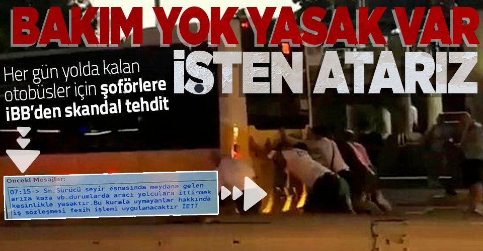 İBB'nin rezalet sonrası bakımsızlık yüzünden otobüsleri arızalanan şoförleri de işten atmakla tehdit ettiği ortaya çıktı. CHP'li İBB Başkanı Ekrem İmamoğlu imzasıyla arızalanan otobüslerin vatandaşlar tarafından itilmesi yasaklandı. Şoförlere gönderilen yazıya göre otobüsün vatandaş tarafından itilmesine müsaade eden şoförün işine son verileceği açıklandı.