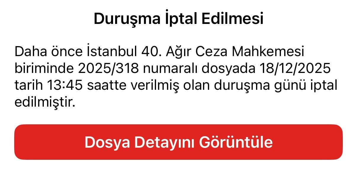 Ancak birkaç dakika sonra "duruşma iptal edilmesi" başlıklı bir bildiriyle o tarihte verilen 2025/318 sayılı İBB davasının 18.12.2025 tarihinde iptal edilen bir bildiri yayımlandı.
