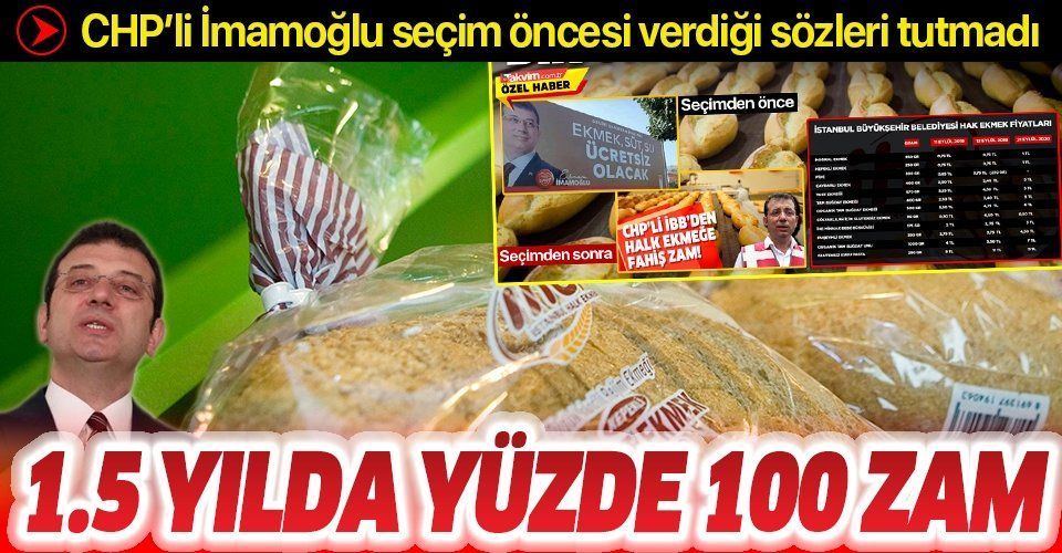 Seçim meydanlarında 'İstanbul'da hayatı ucuzlatacağız' vaadini veren CHP'li Ekrem İmamoğlu, İstanbul Büyükşehir Belediyesi (İBB) koltuğuna oturduktan sonra İstanbulluyu zamma boğdu. Göreve geldikten 2 ay sonra İstanbul Halk Ekmek'te ürün bazlı olarak yüzde 40 ila yüzde 50 arası zam yapan CHP'li İBB yönetimi bir zam kararı daha aldı. Halkın ekmeğine ürün bazlı olarak yüzde 33 ila 50 arasında zam yaptı. 'Daha önceki yönetim 2.5 senedir zam yapmamış' diyerek zamlara yönelik tepkilere cevap veren İmamoğlu yönetimi tarafından tam buğday ekmeği ilk etapta 2.50 TL'den 3.40 TL'ye, son zamla birlikte 5.00 liraya yükseltildi.