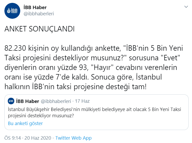 İstanbul Büyükşehir Belediyesi'nin sosyal medya hesaplarından İBB Haber'de yapılan ve 'Yeni Taksi Projesi'ne ilişkin yurttaşların fikri sorulan anket sonuçlandı.