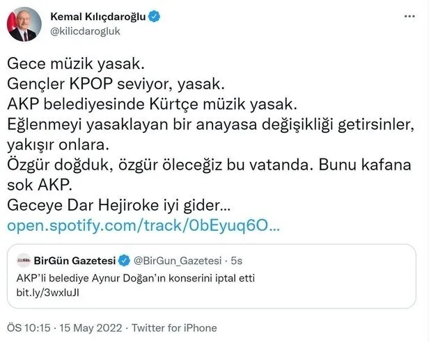"Gece müzik yasak. Gençler KPOP seviyor, yasak. AKP belediyesinde Kürtçe müzik yasak. Eğlenmeyi yasaklayan bir anayasa değişkliği getirsinler, yakışır onlara. Özgür doğduk, özgür öleceğiz bu vatanda. Bunu kafana sok AKP. Geceye Dar Hejroke iyi gider…"