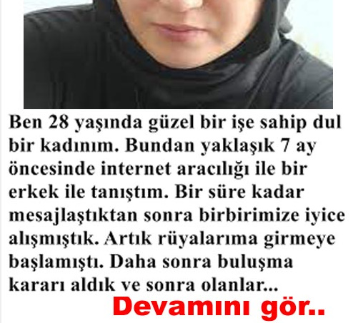 Mutlaka Okuyun ve Paylaşın Ben 28 yaşında güzel bir işe sahip dul bir kadınım. Bundan yaklaşık 7 ay öncesinde internet aracılığı ile bir erkek ile tanıştım. Bir süre mesajlaştıktan sonra birbirimize iyice alışmıştık. Artık rüyalarıma girmeye başlamıştı. Daha sonra buluşma kararı aldık. Söylediği her söz şiir gibi geliyordu. Hem yakışıklı hemde her zaman şık giyinmesi beni çok etkiliyordu. O kadar muhteşem bir görünüşü vardı ki her anlamda, ona kısa zamanda aşık oldum. Çünkü eski eşim çok çektirmişti. Şansın ilk kez benden yana olduğunu düşünüyordum. Ancak çok yanıldığımı bir süre sonra anladım. Benim…