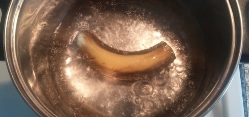 İhtiyacınız olanlar, bir muz, bir tencere, biraz su, bir de isterseniz bir tutam tarçın…Önce tencerede suyumuzu kaynatıyoruz. Sonra muzumuzu, uçlarını kesip, kabuklarıyla birlikte tencereye yerleştiriyoruz.