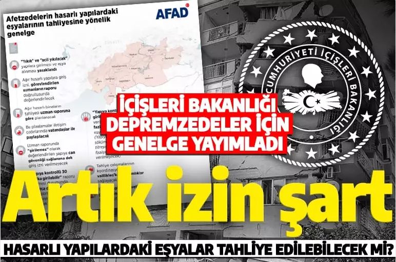 İçişleri Bakanlığı'nın Çevre, Şehircilik ve İklim Değişikliği Bakanlığı ile ortak çalışma sonucu, deprem bölgelerinde "yıkık", "acil yıktırılacak" ve "ağır hasarlı" yapılardaki eşyaların tahliyelerine yönelik esaslar belirlendi.