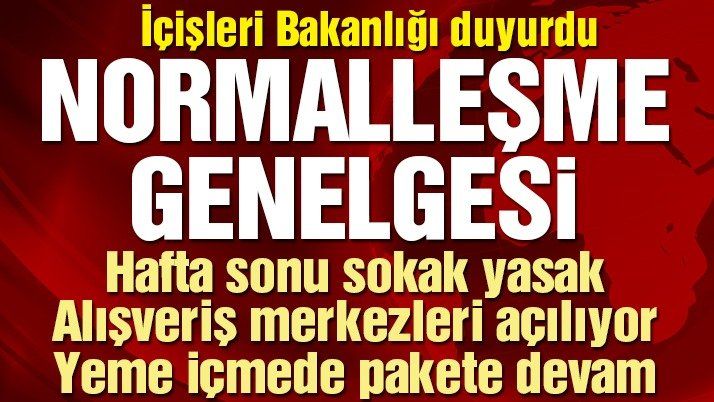Kademeli normalleşme döneminde; hafta içerisinde yer alan günlerde (Pazartesi, Salı, Çarşamba, Perşembe ve Cuma) 21.0005.00 saatleri arasında, hafta sonları ise Cuma günleri saat 21.00'den başlayıp, Cumartesi ve Pazar günlerinin tamamını kapsayacak ve Pazartesi günleri saat 05.00'te tamamlanacak şekilde sokağa çıkma kısıtlaması uygulanacaktır.