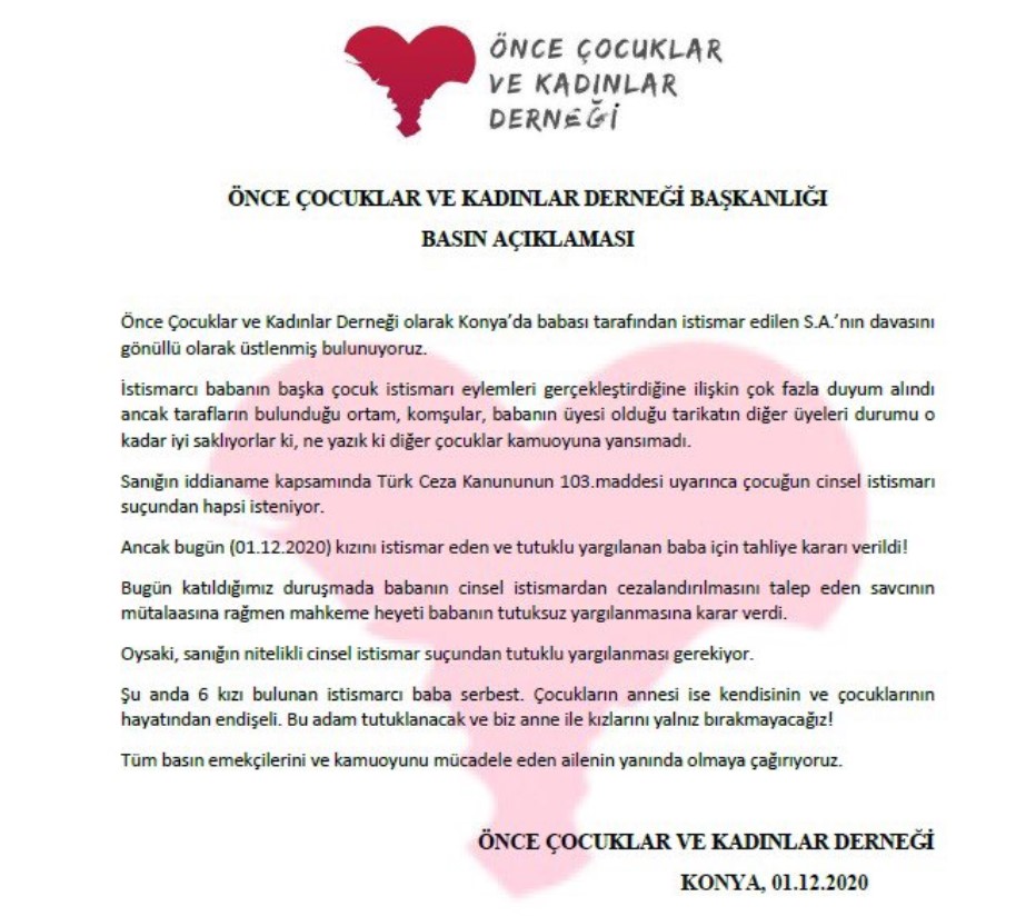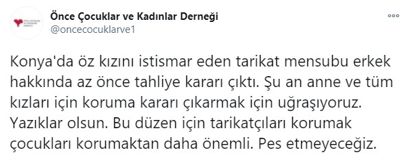 "Konya'da öz kızını istismar eden tarikat mensubu erkek hakkında az önce tahliye kararı çıktı. Şu an anne ve tüm kızları için koruma kararı çıkarmak için uğraşıyoruz. Yazıklar olsun. Bu düzen için tarikatçıları korumak çocukları korumaktan daha önemli. Pes etmeyeceğiz."