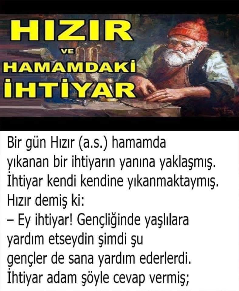 Bir gün Hz.Hızır hamamda yıkanan bir ihtiyarın yanına yaklaşmış. İhtiyar kendi kendine yıkanmaktaymış.