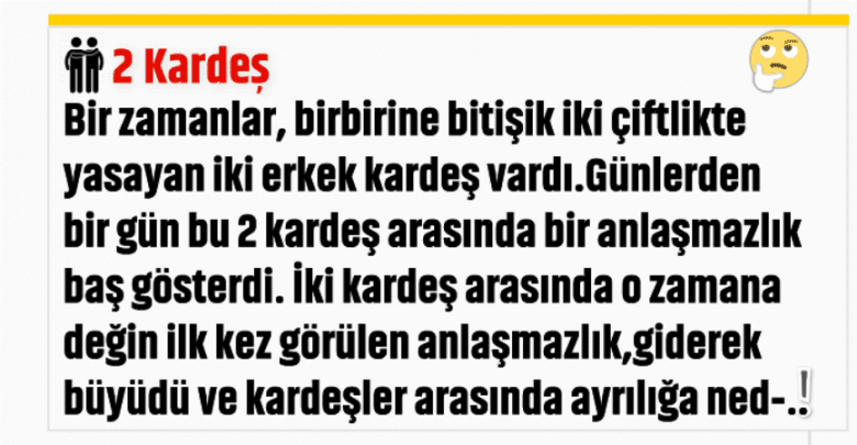Birbirine bitişik 2 çiftlikte yaşayan 2 erkek kardeş arasında bir gün bir anlaşmazlık baş gösterdi. kardeşler arasında o zamana değin ilk kez görülen anlaşmazlık, giderek büyüdü ve kardeşler arasında ayrılığa neden oldu. 2 kardeş, birbirlerine yalnızca küsmekle kalmadılar, yıllardır ortaklaşa kullandıkları tarım makinelerine değin sahip oldukları tüm araç gereçlerini ve mal varlıklarını da ayırdılar.