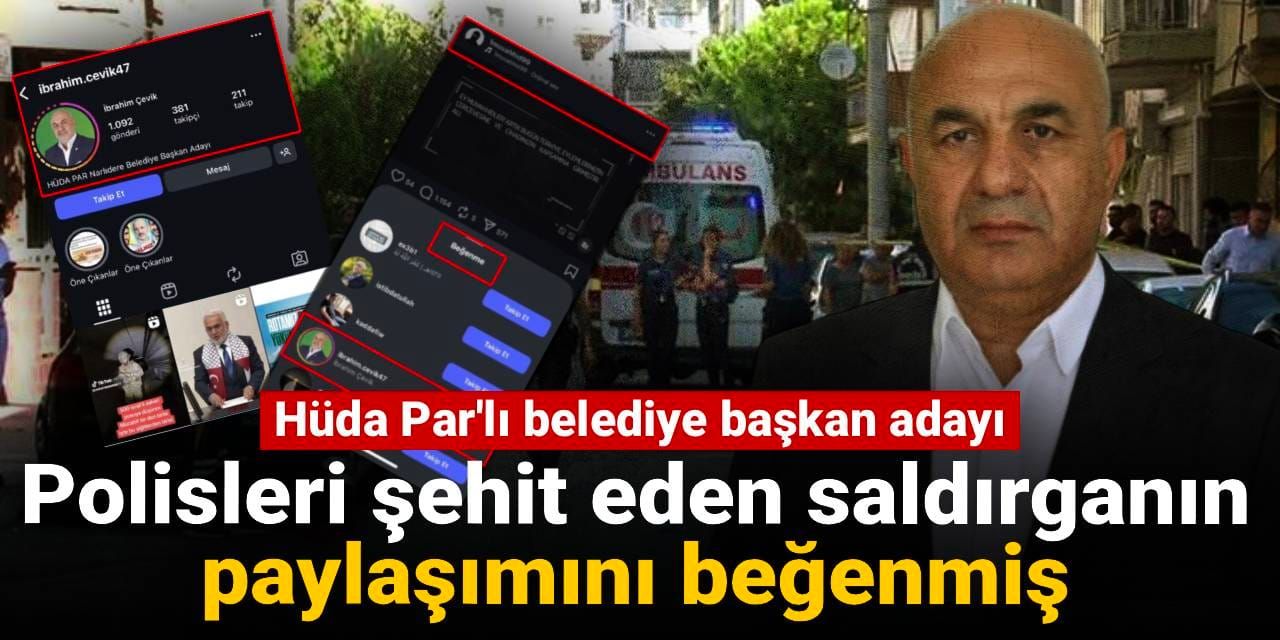 İki polisin şehit olduğu hain saldırıyı gerçekleştiren saldırganın paylaşımını beğenen Hüda Par'lı İbrahim Çevik'in sosyal medya hesaplarında hala "HÜDA PAR Narlıdere Belediye Başkan Adayı" yazması da dikkat çekti.
