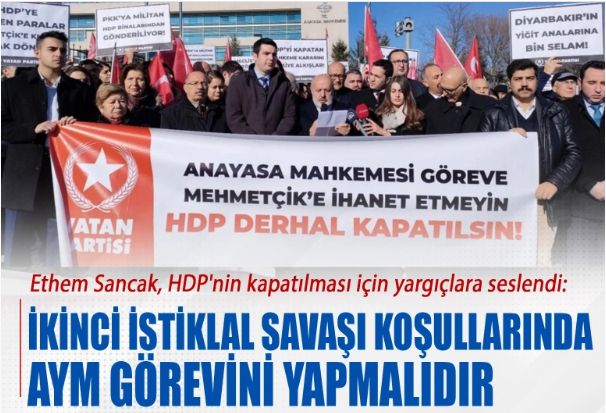Vatan Partisi Genel Başkan Yardımcısı Ethem Sancak yaptığı basın açıklamasında, HDP'nin kapatılması için yargıçlara seslendi. Sancak, "Anayasa Mahkemesi’nden ve değerli Yargıçlarımızdan, İstiklal Mahkemelerinin tavrını bekliyoruz." dedi.