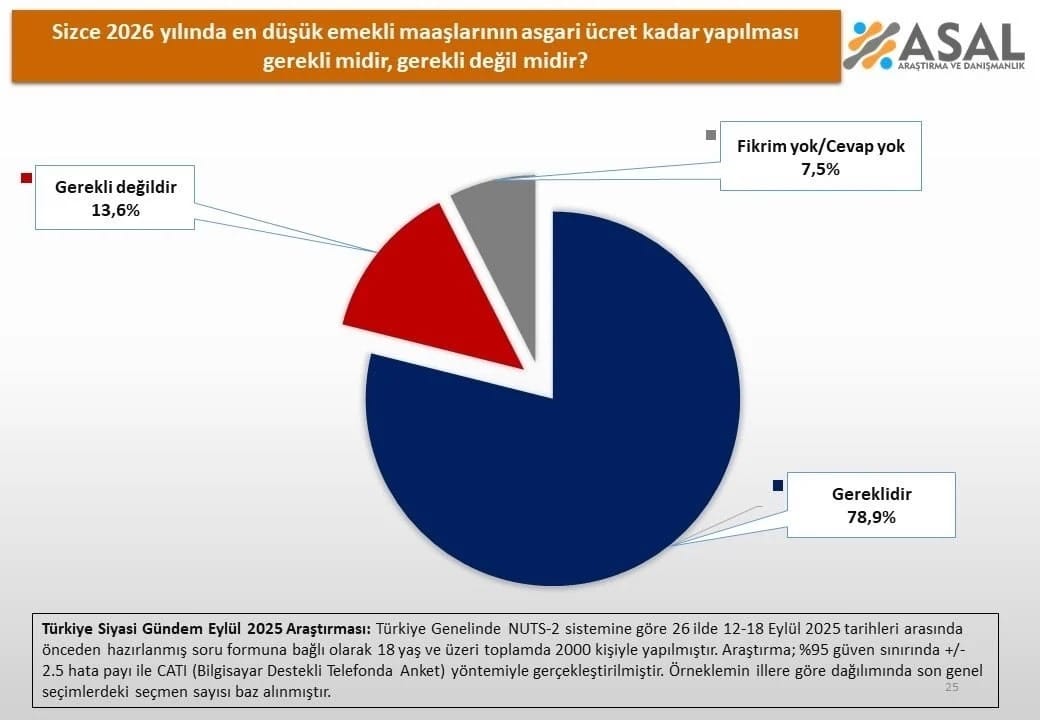 Türkiye genelinde 26+ ilde yapılan anket sonuçlarına göre 2026 yılında en düşük emekli maaşının en düşük olarak asgari ücret kadar yapılmasını isteyenlerin oranı yüzde 78,9 olarak yansıdı.