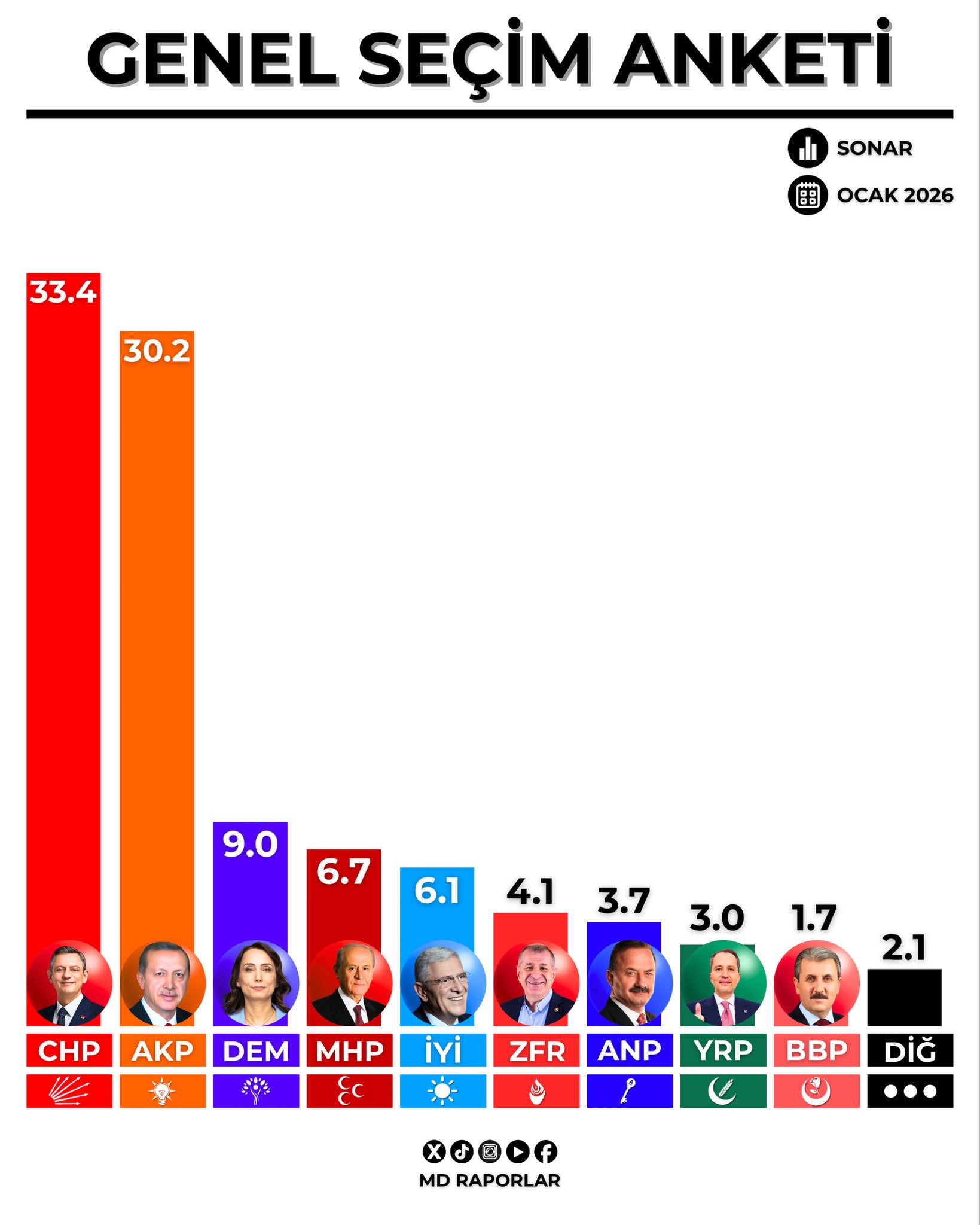 SONAR Araştırma’nın son anketi kamuoyuyla paylaşıldı. SÖZCÜ TV’de Barış Terkoğlu ile Özlem Gürses’in sunduğu programda açıklanan ankette, CHP ve AK Parti arasındaki farkın yüzde 3 seviyelerinde olduğu görüldü.
