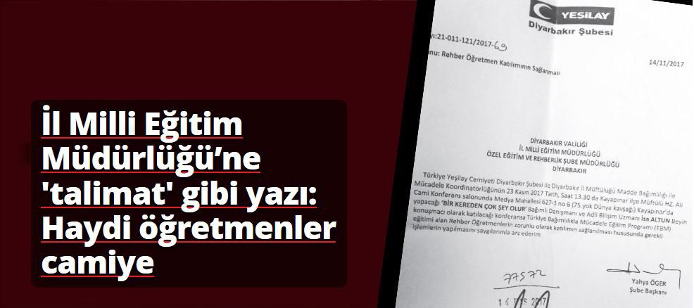 Eğitimin dinselleştirilmesi yönünde her gün yeni adımlar atılıyor. Yeşilay Diyarbakır Şubesi’nden İl Milli Eğitim Müdürlüğü’ne “talimat” gibi bir yazı gönderilerek, ildeki rehber öğretmenlerin bir camide gerçekleştirilecek uyuşturucu konulu toplantıya “zorunlu olarak katılım sağlanması” konusunda gerekli işlemlerin yapılması istendi.