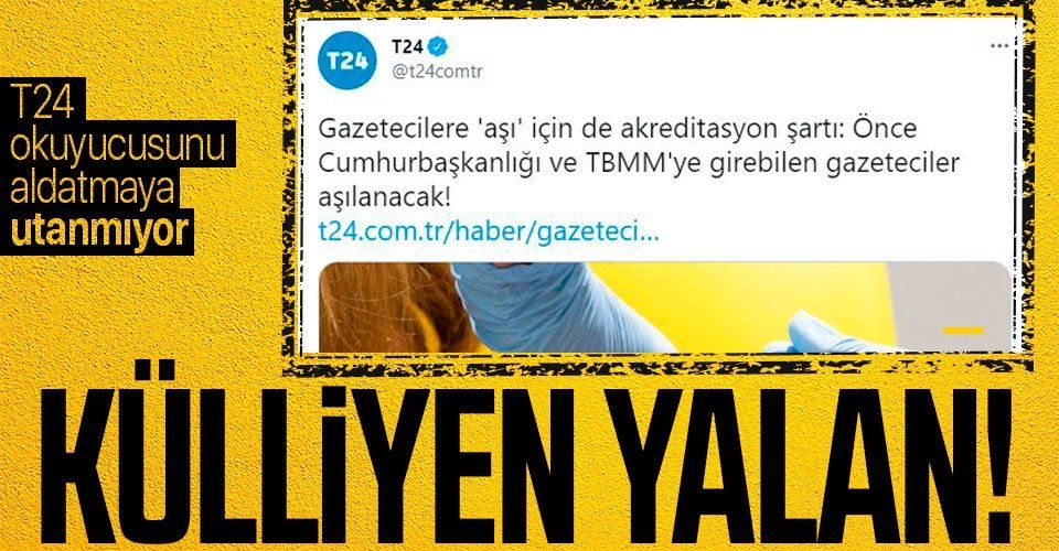 Yurt dışından fonlandığı bilinen, manipülatif ve yalan haberleriyle ünlü CHP yandaşı T24 yine asılsız bir habere imza attı. T24'ün "Gazetecilere 'aşı' için de akreditasyon şartı: Önce Cumhurbaşkanlığı ve TBMM'ye girebilen gazeteciler aşılanacak!" haberinin yalan olduğu ortaya çıktı. 'İLETİŞİM BAŞKANLIĞI LİSTE İSTEDİ' İDDİASI YALANLANDI Eker yaptığı açıklamada, İletişim Başkanlığının, medya kurumlarını arayıp "Kovid19 aşısı için liste istediği" külliyen yalandır." ifadelerine yer verdi. "ALDATMAKTAN UTANMIYOR MUSUNUZ?" Eker'in Twitter üzerinden yaptığı açıklama şu şekilde: İletişim Başkanlığının, medya kurumlarını arayıp "Kovid19 aşısı için liste istediği" külliyen yalandır. "İddiaya göre haberciliği" aldatmacasından utanmıyor musunuz? Operasyon haberciliğini bir kenara bırakıp gazetecilik dersinin ilk kuralı 5N1K'yı tekrar hatırlamalısınız!