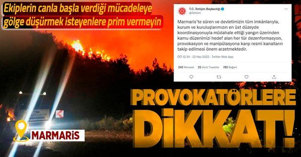 Açıklamada, "Marmaris'te süren ve devletimizin tüm imkanlarıyla, kurum ve kuruluşlarımızın en üst düzeyde koordinasyonuyla müdahale ettiği yangın üzerinden kamu düzenimizi hedef alan her tür dezenformasyon, provokasyon ve manipülasyona karşı resmi kanalların takip edilmesi önem arz etmektedir." ifadesi kullanıldı.