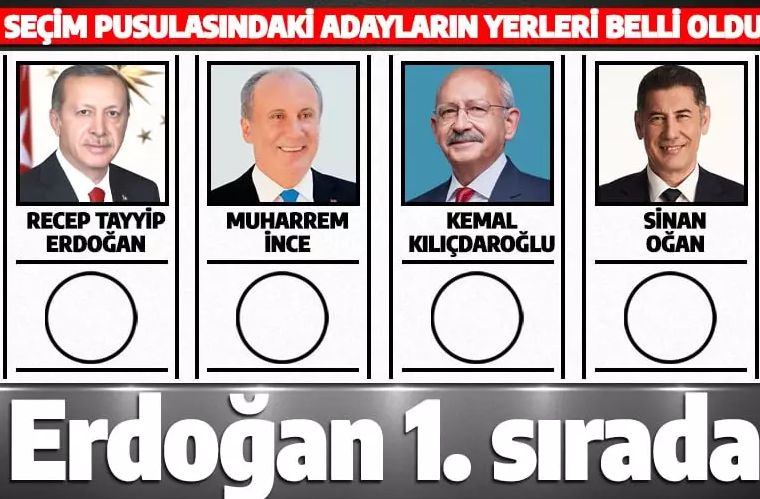 Buna göre Cumhurbaşkanı Erdoğan oy pusulasında ilk sırada yer alırken 2. sırada Muharrem İnce, 3. sırada Kemal Kılıçdaroğlu ve 4. sırada Sinan Oğan yer aldı.