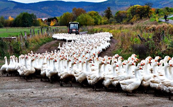Dönüş yolunda otomobiliyle ilerlerken, bir kaz sürüsüyle karşılaşır.