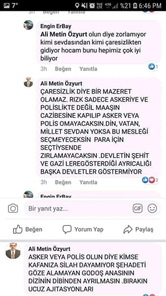 Bir vatandaşın yaptığı “Kimse zorlamıyor, kimi sevdasından, kimi çaresizlikten gidiyor hocam bunu hepimiz çok iyi biliyoruz” yorumuna cevap veren Özyurt, çaresizliğin bir mazeret olmayacağını vurgulayarak “Rızk sadece askeriye ve polislikte değil. Maaşın cazibesine kapılıp asker veya polis olmayacaksın. Din, vatan, millet sevdan yoksa bu mesleği seçmeyeceksin. Para için seçtiysen de zırlamayacaksın. Devletin şehit ve gazilere gösterdiği ayrıcalığı başka devletler göstermiyor” dedi.