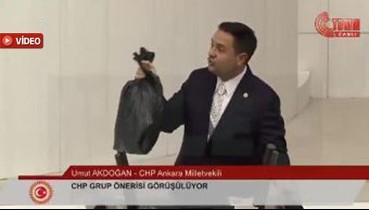 CHP'li Akdoğan 'Aziz İhsan Aktaş' iddianamesini siyah poşete koyarak Meclis kürsüsüne çıktı: "İçinde ayıplı şeyler var"