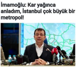 Ekrem İmamoğlu, nereyi yönettiğinin yeni farkına vardı. Skandallarla gündemi meşgul etmeyi başaran İmamoğlu "Kar yağınca İstanbul'un büyük metropol olduğunu anladım" sözleriyle "Bu adam hala nereyi yönettiğinin farkında değil mi?" dedirtti.