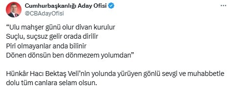 Ekrem İmamoğlu Hacı Bektaş Veli anması mesajını paylaştı. Yaptığı paylaşıma dikkat çekici bir şiir ekleyen İmamoğlu, "Dönen dönsün ben dönmezem yolumdan" ifadeleri ile dikkat çekti.