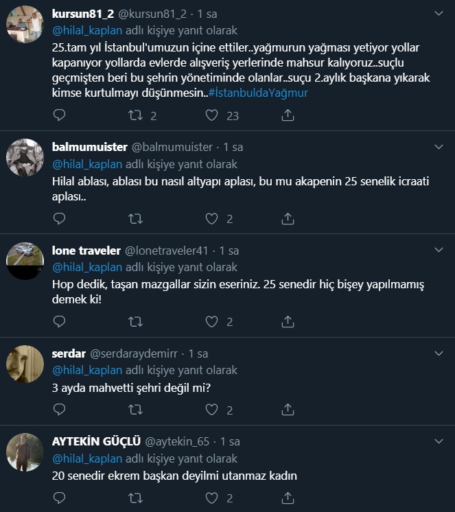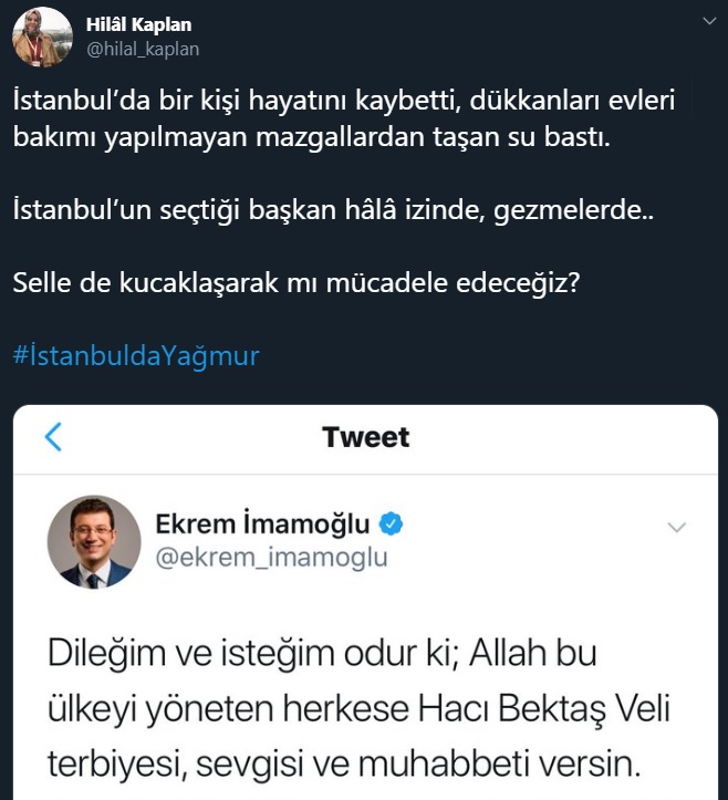 Yandaş sabah yazarı Hilal Kaplan, kişisel sosyal medya hesabı üzerinden İstanbul'da yoğun yağış sonucu gerçekleşen seli bahane ederek İstanbul Büyükşehir Belediye Başkanı Ekrem İmamoğlu'nu hedef alınca, takipçilerinden ve Twitter kullanıcılarından beklemediği tepkiler aldı.