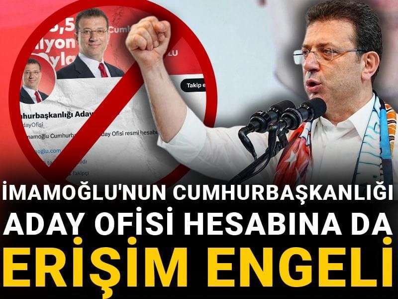 Tutuklu Cumhurbaşkanı Adayı ve İBB Başkanı Ekrem İmamoğlu'nun, yüzbinlerce takipçiye saihp Cumhurbaşkanlığı Aday Ofisi hesabı hakkında da erişim engeli kararı verildi.