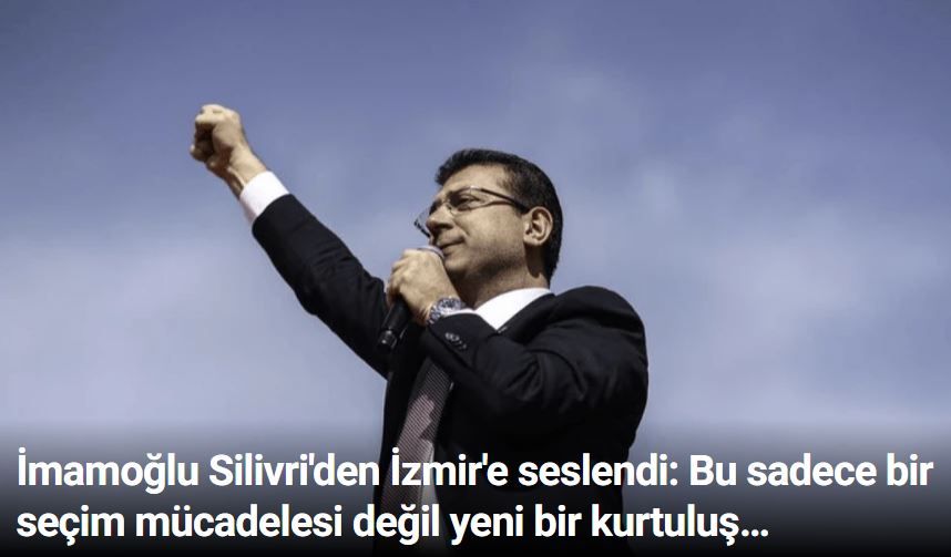 Herkesin özgür, adil ve müreffeh bir hayat süreceği günlere hep birlikte mücadele ederek kavuşacağız. Güçlü, demokratik devlet anlayışıyla ekonomimizi ayağa kaldıracağız. İzmir’i ve Ege’yi yeniden üretimin, tasarımın, ihracatın, tarımın ve teknolojinin merkezi yapacağız. Herkese iş, her haneye huzur, her çocuğa gelecek sunacağız. Bu sadece bir seçim mücadelesi değil, bu yeni bir kurtuluş mücadelesidir. Biz, milletin iktidarını kurmaya geliyoruz. Biz, milletiyle barışık, halkına hesap veren bir yönetimi inşa etmeye geliyoruz. Biz, yeniden eşitlik, yeniden adalet, yeniden kardeşlik için geliyoruz. Gençliğin vicdanıyla, gençliğin enerjisiyle, gençliğin cesaretiyle geliyoruz. Gençler, düşledikleri hayatı burada, kendi vatanlarında, kendi elleriyle kursunlar diye geliyoruz. Biz kazanacağız. 86 milyon vicdanlı yurtsever kazanacak. Hak yemekten korkan, ama asla hakkını yedirmeyenler kazanacak. Adalet, haysiyet ve cesaret kazanacak. Haydi İzmir; kurtuluş yok tek başına, hep birlikte görev başına… Ekrem İmamoğlu. Silivri Cezaevi.”