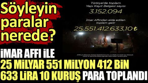 İmar affı ile tam tamına 25 milyar 551 milyon 412 bin 633 lira 10 kuruş para toplandı. Herkes aynı soruyu soruyor Söyleyin paralar nerede?