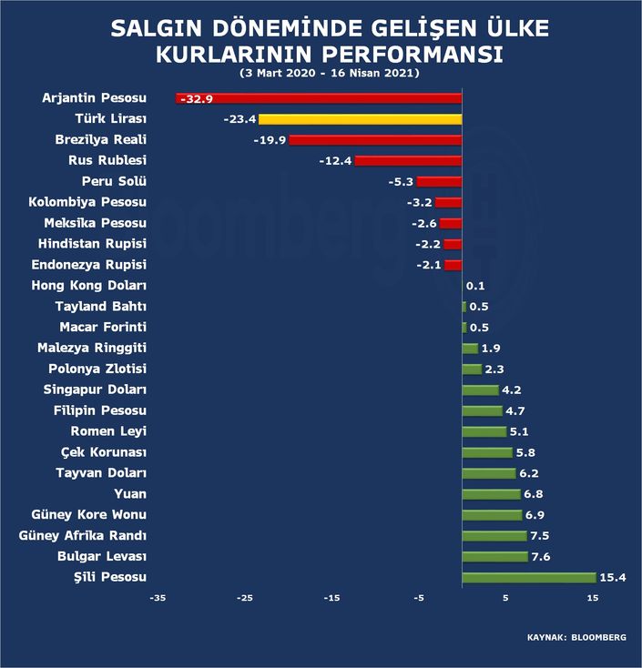 Gelişen ülke para birimleri arasında salgın döneminde en fazla değer kaybeden para birimi yüzde 32,9 düşüş ile Arjantin pesosu olurken, ikinci sırada yüzde 23,4 ile Türk Lirası geliyor.