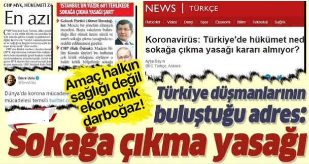 Türkiye erken davranarak aldığı tedbirlerle virüsün ülkeye sıçramasını geciktirdi ve etkisini çok sınırlı tutmayı başardı. Türkiye'nin başarısını görmezden gelen bazı kesimler, sokağa çıkma yasağı üzerinden provokasyona başladı. Sokağa çıkma yasağı üzerinden hükümete baskı yapanların amacı ne yazık ki vatandaşın sağlığı değil. Özellikle dış basının da sıkça desteklediği bazı kesimler, üretimin durması, tedarik zincirinin kırılması, mafyacılığa ve stokçuluğa gün doğması, sokakların askere teslim olması ve özellikle ekonomik dar boğaza girilip IMF'den borç istenmesi derdinde..