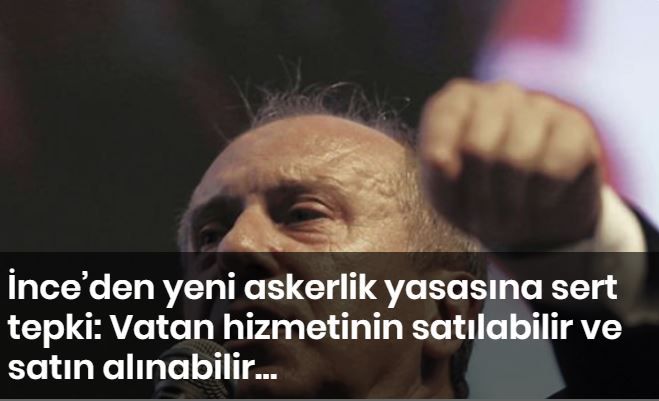 Muharrem İnce sosyal medya hesabından yeni askerlik sistemine ilişkin “Yürürlüğe giren yeni askerlik yasası askerliğin vatan hizmeti olduğu anlayışını tümüyle sakatlamaktadır. Yasa, vatan hizmetinin satılabilir ve satın alınabilir bir hizmet olarak görmektedir. Kısacası zenginimiz bedel öder, askerimiz fakirdendir anlayışı esas alınmıştır.” ifadelerini kullandı.