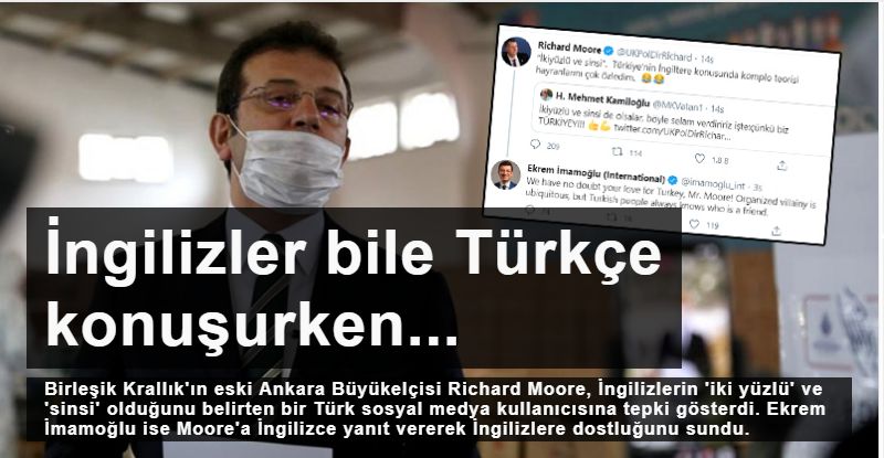 Birleşik Krallık'ın eski Ankara Büyükelçisi Richard Moore, İngilizlerin 'iki yüzlü' ve 'sinsi' olduğunu belirten bir Türk sosyal medya kullanıcısına tepki gösterdi. Ekrem İmamoğlu ise Moore'a İngilizce yanıt vererek İngilizlere dostluğunu sundu.