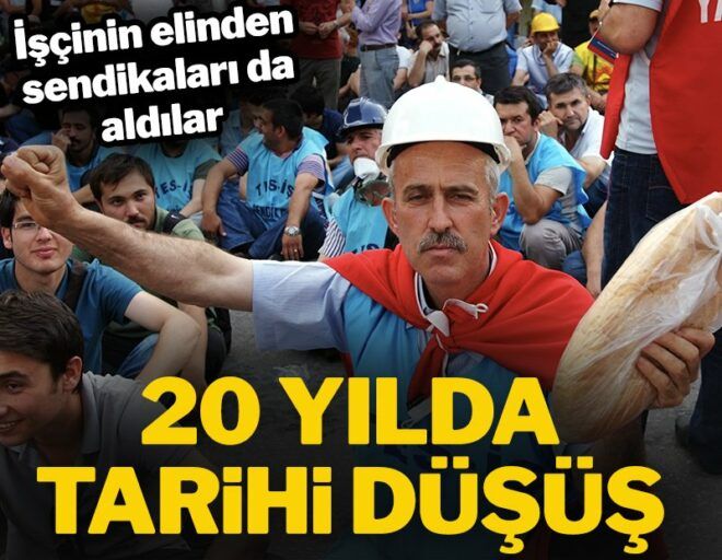 AKP’nin iktidara gelmesinin ardından Ocak 2003'te 4 milyon 686 bin 618 kayıtlı işçiden 2 milyon 717 bin 326 işçinin sendika üyeliği bulunuyordu. Bir diğer değişle sendikaya üyelik oranı yüzde 58’di. Aradan geçen 20 yılda bu oran dramatik bir şekilde düşerek yüzde 15’e kadar geriledi.
