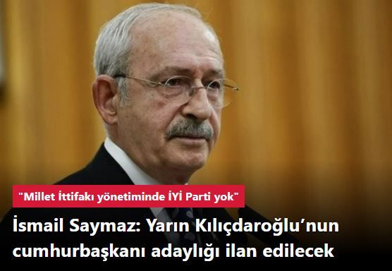 "Millet İttifakı yarın 14’te Saadet Partisi Genel Merkezi’nde buluşacak. Liderlerin toplantısından sonra SP önünde Kılıçdaroğlu’nun cumhurbaşkanı adaylığı ilan edilecek. Ardından Kılıçdaroğlu, CHP’ye geçecek. Adaylık lansmanı 10 Mart’ta seçim takviminin ilanından sonra yapılacak.