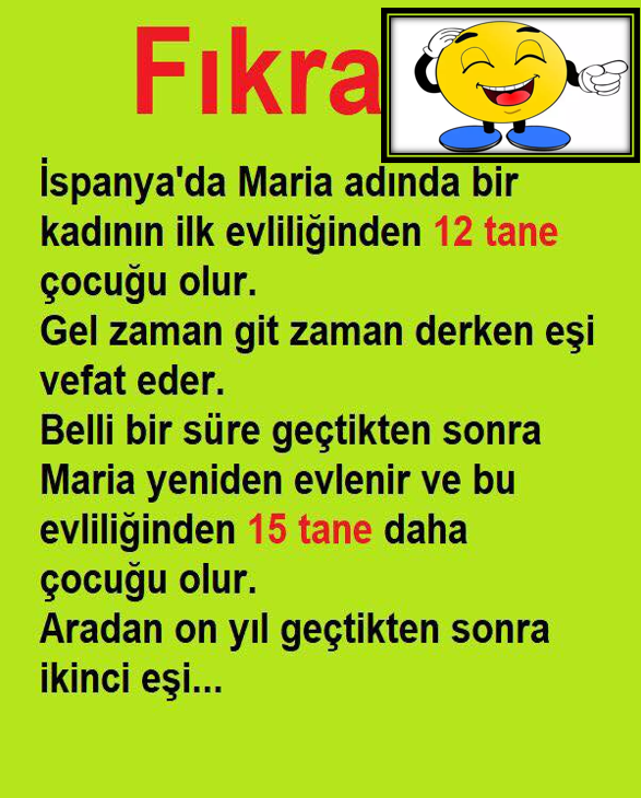 İspanya'da Maria adında bir kadının ilk evliliğinden 12 tane çocuğu olur. Gel zaman git zaman derken eşi vefat eder. Belli bir süre geçtikten sonra Maria yeniden evlenir ve bu evliliğinden 15 tane daha çocuğu olur. Aradan on yıl geçtikten sonra ikinci eşi de… devamını görmek için görsele dokunun devam edin diğer sayfadan.