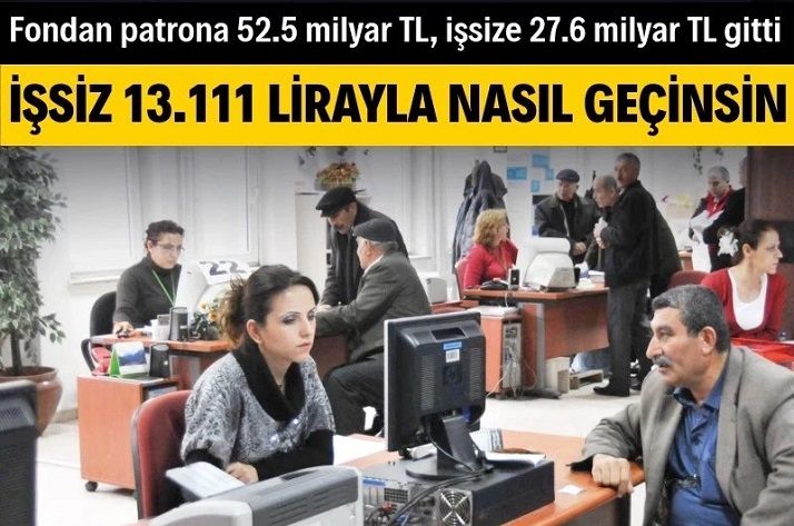 Toplam gelirin, sadece yüzde 17’si işsizlik ödeneğine harcandı. Öte yandan patronlara aktif işgücü programları kapsamında 18 milyar 932 milyon 923 bin TL, işbaşı eğitim programları için 10 milyar 432 milyon 540 bin TL ve teşvik-destek ödemeleri adı altında 23 milyar 208 milyon 290 bin TL olmak üzere toplam 52 milyar 573 milyon 753 bin TL aktarıldı. Patronlara transfer edilen kaynak, işsizlere ödenen parayı ikiye katladı.