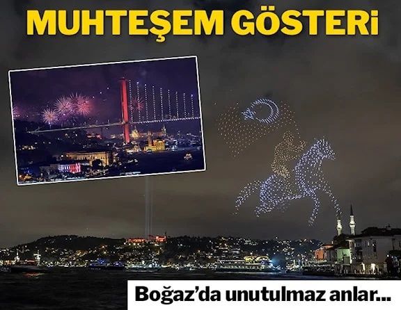 Cumhuriyet’in 100. yıl dönümü dolayısıyla İstanbul Boğazı’nda havai fişek, ışık ve drone gösterileri düzenlendi.