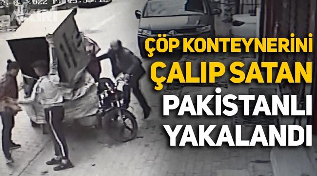 İstanbul Avcılar'da 'Çek çek' olarak bilinen motosiklete bağlı el arabası ile gelerek sokaktaki metal çöp konteynerini çalan hırsız yakalandı. Pakistanlı olduğu ortaya çıkan şahsın konteyneri hurda olarak sattığı belirtildi.