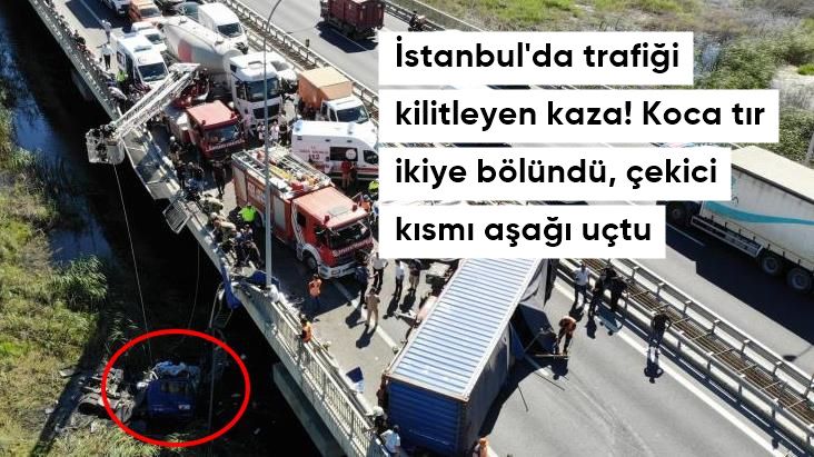 İstanbul Büyükçekmece'de yürek burkan bir kaza meydana geldi. TEM Otoyolu'nda sürücünün direksiyon hakimiyetini kaybetmesi sonucu bariyerlere çarpan tırın çekici kısmı viyadükten düştü.