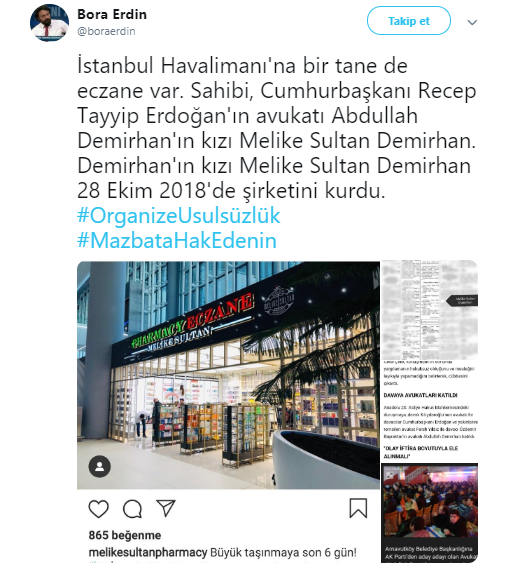 İstanbul Havalimanı'nda Erdoğan'ın çocukları Bilal ve Sümeyye'nin restoran ortağı olduğunun ortaya çıkmasından sonra şimdi de havalimanındaki tek eczanenin Erdoğan'ın avukatı Abdullah Demirhan'ın kızı Melike Sultan Demirhan'a ait olduğu ortaya çıktı.