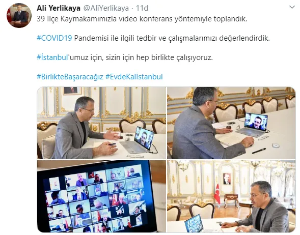 Vali Yerlikaya, toplantıyla ilgili sosyal medya hesabından yaptığı paylaşımda, "39 İlçe Kaymakamımızla video konferans yöntemiyle toplandık. #COVID19 Pandemisi ile ilgili tedbir ve çalışmalarımızı değerlendirdik. #İstanbul'umuz için, sizin için hep birlikte çalışıyoruz." ifadelerine yer verdi.