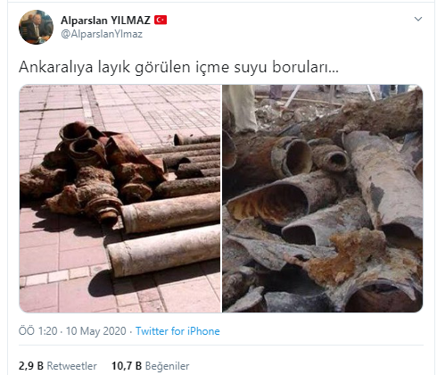 BELTAŞ Genel Müdür Yardımcısı Alparslan Yılmaz Saray İttifakı'nın yenilenmesini engellediği boruların fotoğrafını "Ankaralıya layık görülen su boruları" diyerek paylaştı.