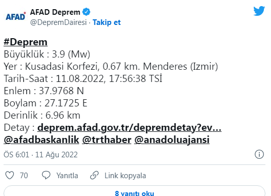 d-detinde bir deprem meydana geldi. Peki, İzmir’de deprem mi oldu, kaç büyüklüğünde? AFAD ve Kandilli son depremler listesi… AFAD’dan gelen açıkamaya göre; İzmir’de ve çevre illerde hissedilen Kuşadası Körfezi’nde 3.9 şi-detinde bir deprem meydana geldi.