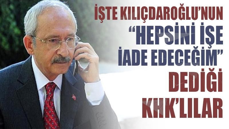 30’a yakını KHK ile ihraç edilmiş Milli Eğitim’de öğretmen, 4’ü kamuda mühendis, okutman, 6’sı doktor, vergi müfettişi, infaz koruma memuru, TRT muhabiri, yapımcısı, anestezi uzmanı, biyolog; 25 dolayında da özel sektör çalışanı var. Özel sektör çalışanları dışında kalanların tamamına yakını KHK ile ihraç edilmiş. Dördü de başka operasyonlarda yakalanarak daha önce tutuklanıp cezaevine konmuş. İşte size, CHP Genel Başkanı, Kemal Kılıçdaroğlu’nun, “Hepsini işine iade edeceğim” dediği KHK’lılardan bazıları.