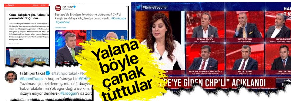 Özellikle FOX TV'nin sunucuları Fatih Portakal ve İsmail Küçükkaya gibi isimler CHP'nin iddialarını parlatarak algı operasyonuna alet oldular. Fatih Portakal, Twiter'dan yaptığı paylaşımda "#RahmiTuran'in bugun "saraya bir #CHP'li gitti" yazısı dikkat çekiyor. Yazılması için belirlenmiş, muhalif, duayen bir isme uçurulmuş aspar bir haber olabilir mi?Yok eğer doğru ise kim, kime oyun çekiyor? Bu durum parti dizayn ediyor denilerek #Erdogan'i da zorda bırakır." ifadeleriyle CHP'nin tiyatrosu üzerinden algı yaparak okları Erdoğan'a çevirmek istedi.