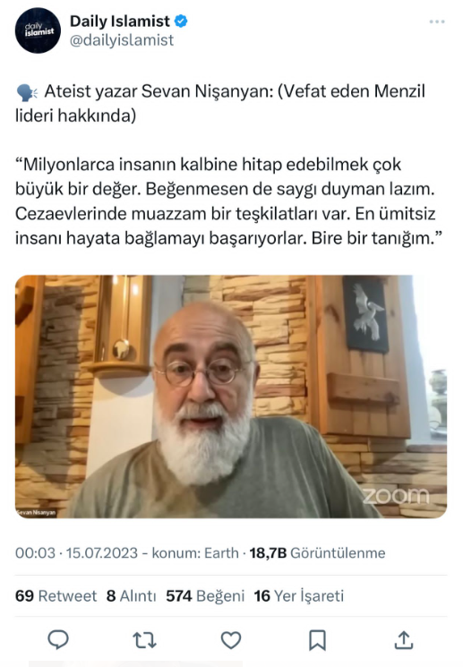 Ermeni asıllı ateist yazar Sevan Nişanyan Menzil lideri Abdülbaki ElHüseyni’nin vefatının ardından sosyal medya hesabından bir paylaşım yaptı. Nişanyan’ın yaptığı değerlendirme seküler kesimde infiale neden oldu