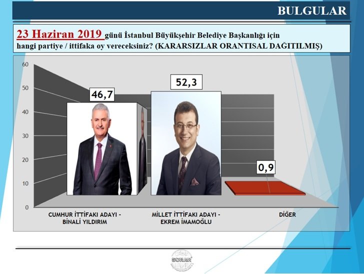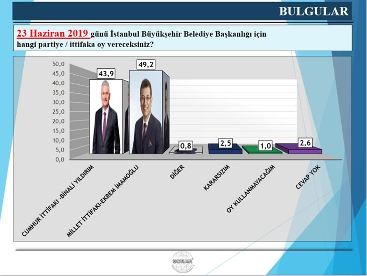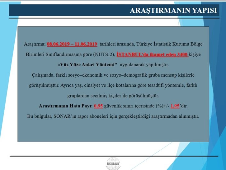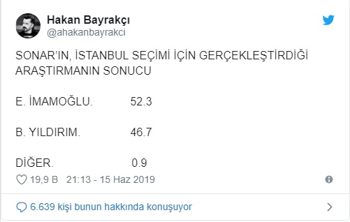 Araştırmacı Hakan Bayrakçı’nın sahibi olduğu SONAR Araştırma şirketi, 23 Haziran İstanbul Büyükşehir Belediye Başkanlığı seçimlerine ilişkin son anketini açıkladı.