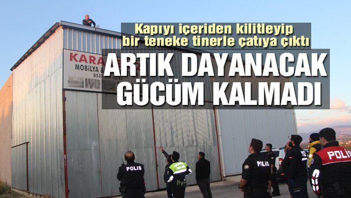Manavgat’ta dekorasyon atölyesi sahibi A.K. kendisine ait olmayan bir borç yüzünden iş yerinde bulunan makinelere icra geldiği gerekçesiyle iş yerinin çatısına çıktı. Avukat ve icra memurlarının icra işlemi yapmak amacıyla iş yerine gelmesinin ardından, atölyesinin kapısını içeriden kilitleyerek elinde tiner tenekesiyle çatıya çıkan A.K. hareketli anların yaşanmasına neden oldu.