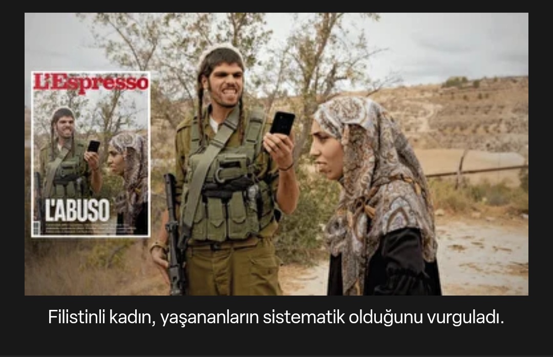 İtalya’da yayımlanan L’Espresso dergisinin kapağına taşıdığı, işgal altındaki Batı Şeria’da askeri üniforma giymiş bir İsrailli gaspçıların Filistinli bir kadınla alay ettiği anı yansıtan fotoğraftaki Filistinli kadın, "Bu görüntü, tekil bir olay değil, daha derin ve sistematik bir politikanın parçası." dedi.L’Espresso dergisinin kapağına taşıdığı fotoğraftaki Filistinli avukat Miad Ebu’l-Rub, Filistin topraklarını gasbeden İsraillilerin saldırılarını ve yaşanan baskıları AA’ya değerlendirdi.